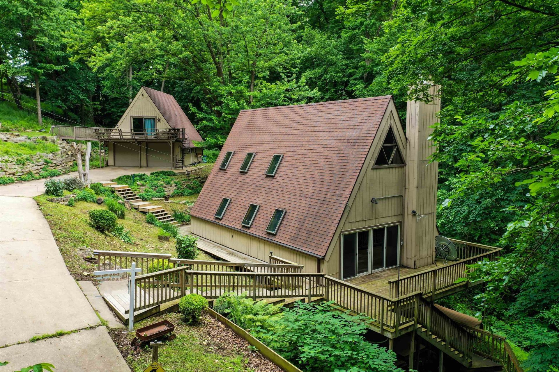 2 homes for the price of 1! This breathtaking A frame is nestled in the woods surrounded by natural beauty and a nature preserve. The main home is 2 bedroom, 2 bath with a walk in closet and private bed and bath in the loft area. Beautiful wood flooring, stainless steel appliances and character you'll never get tired of. The "bunk house" above the garage is cute as can be and just the perfect size, 768 sq. ft. This second home has just as much character and charm as the main house offering a nice sized bedroom on the main level and a second bed in the loft. But wait, there's more! 2 stall heated garage with extra room for storage. The large green space below the house can be used as a yard for family gatherings or it's zoned for camper parking or tiny homes.