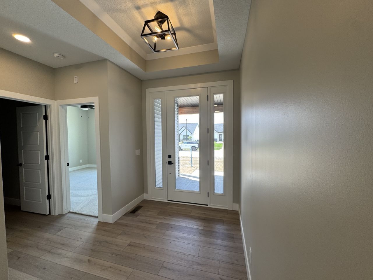 Beautiful new construction ranch by White House Homes Inc. located in Eldridge, Iowa. This thoughtfully designed 3-bedroom home features a desirable split bedroom floor plan with the primary suite situated on one side of the home and two additional bedrooms on the opposite side for added privacy. The spacious foyer welcomes you in and is highlighted by a custom railing leading to the full unfinished basement, offering great potential for future living space. The open-concept main living area flows into the kitchen, complete with quartz countertops, tile backsplash, and a convenient pantry. The primary bedroom features tray ceilings and a private primary bathroom with a tile shower and double vanities. Step outside to enjoy the covered back patio, perfect for relaxing or entertaining. Quality craftsmanship and attention to detail are evident throughout. Don't miss the opportunity to own this beautifully built home in Eldridge. all information is estimated and should be fully verified by buyers and buyers agents for complete accuracy, sod has been digitally added in photo sod will be layed weather permitting